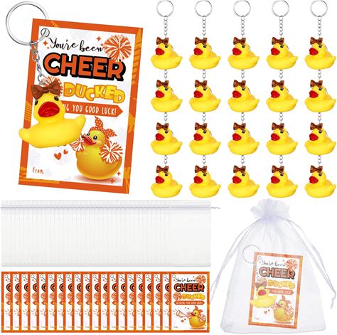 Seenelling Cheer Gifts Bulk Duck Keychain You've Been Cheer Ducked Tags Bow Organza Bags For Valentines Cheerleader Team Gift(Orange,20 Set)
