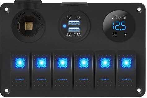 FXC 12 Volt Aluminum Marine Boat Rocker Switch Panel Waterproof 6 Gang Toggle Switch Panel Blue LED Lighted For Car Truck RV UTV ATV With USB