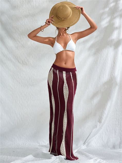 Y2K Street 2Pcs Rainbow Stripe Colorblock Hollow Out Turnover Collar Button Front Short Sleeve Crochet Knit Crop Tee Top & Shorts Striped Colorblock Casual Button Front Button Rib-Knit Beach Vacation,L