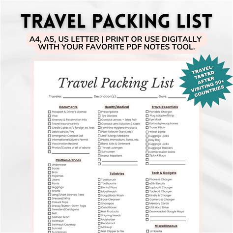 Blank Travel Packing List Printable: A4, A5, Letter (PDF)