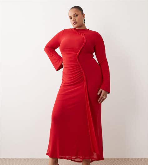 ASOS DESIGN Curve Mesh Long Sleeve Maxi Dress With Twist Detail In Red - Red (Size: 22)